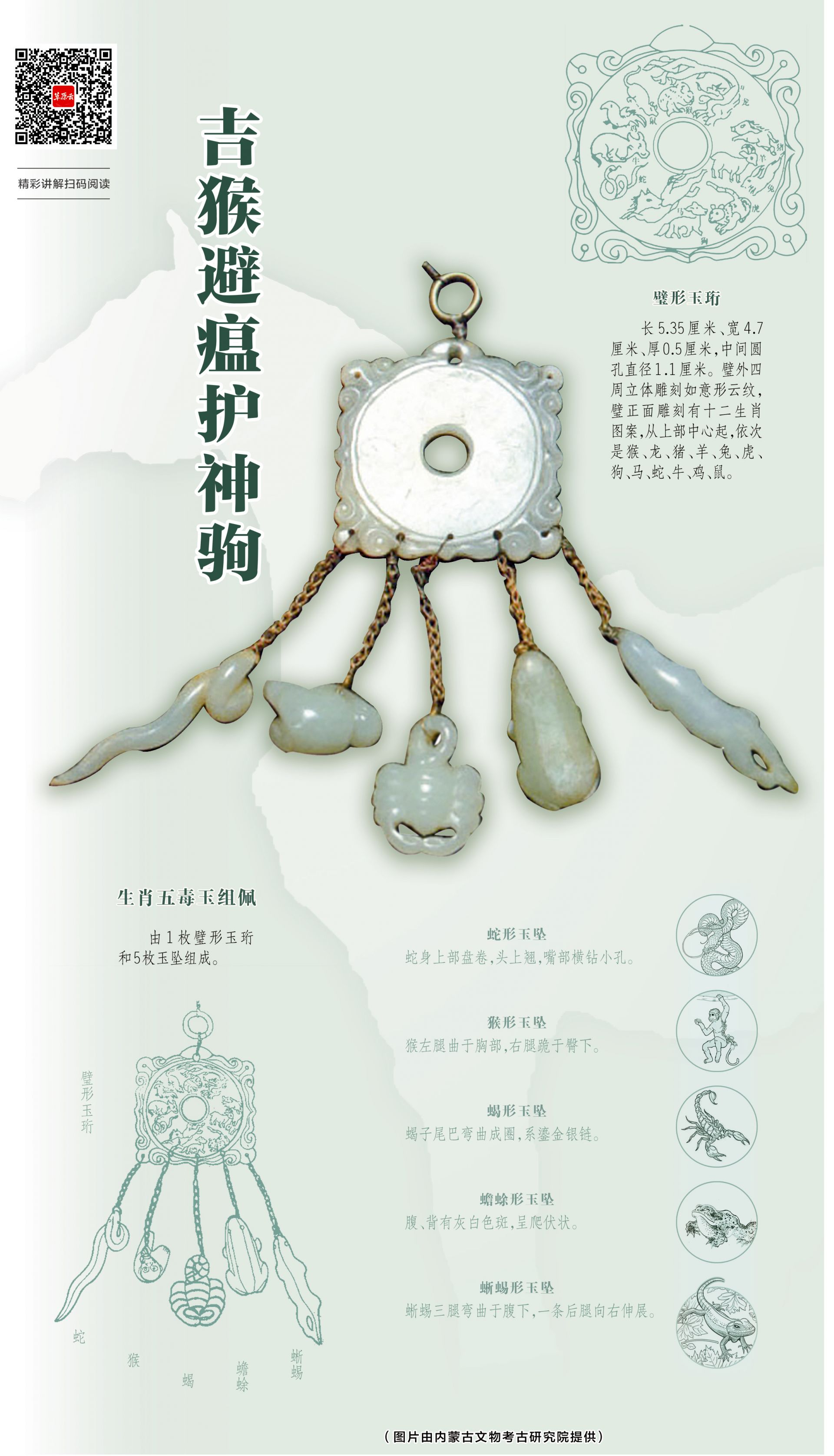 馮吉祥說:“馬是契丹人主要的生活、生產(chǎn)工具。生肖五毒玉組佩是契丹人愛馬、敬馬的實物印證。玉組佩將‘五毒’中的蜈蚣換成了猴子,這個看上去不經(jīng)意間的改動里巧妙地藏著中原民俗與契丹風(fēng)情的交融。古人發(fā)現(xiàn),猴子天性好動,可使馬保持警覺而勤于活動,起到增強體質(zhì)、抵御疫病的作用。北魏賈思勰在《齊民要術(shù)》中有‘常系獼猴于馬坊,令馬不畏,避惡,消百病也’的記載,唐末韓鄂在《四時纂要》里也有類似記述,這種樸素的生存經(jīng)驗在契丹人生活中升華為深厚的文化信仰。馬作為契丹人不可或缺的生活依靠和生產(chǎn)伙伴,防治疫病遠比抵御毒蟲更為迫切。契丹匠人巧妙借用‘猴避馬瘟’的民俗,將猴子納入‘五毒’體系,承載著驅(qū)避馬瘟的祈愿。”